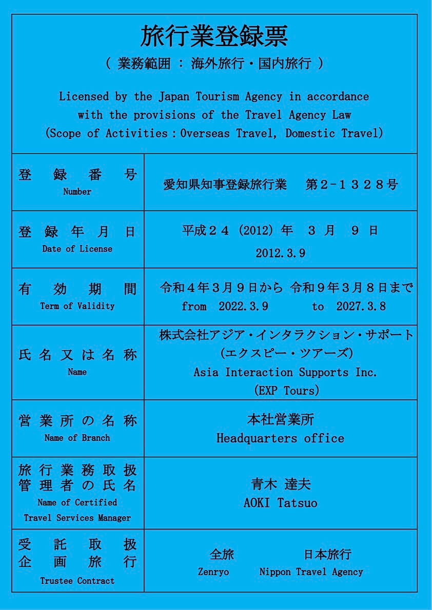 | License | Travel agency #2-1328 registered by Governor of Aichi Prefecture |