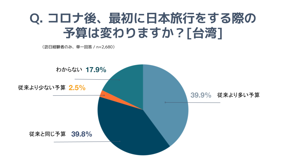 コロナ後の日本旅行の「予算」に関する質問の結果、訪日経験者で「従来より多い予算」と回答した方は台湾人で39.9%、タイ人で41.8%とどちらも4割近い結果になりました。一方「従来より少ない予算」と回答した方は台湾人で2.5%、タイ人で2.7%とわずかで、「予算」を増やす意向が圧倒的に多い結果となっています。どちらの市場もコロナ後の訪日旅行に関しては、今までと同水準もしくは増加の予算になる人が8割を超え、コロナ後のトレンドとしてこれまでより「旅行予算」を増やすことが予想されます。