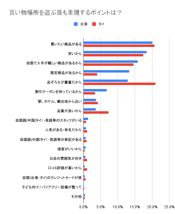 タイ人の買い物場所を選ぶのに最も重視するポイントの1位は、「品揃えが豊富 だから」20.9%でした。