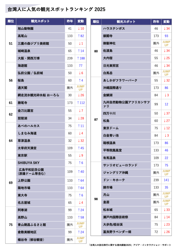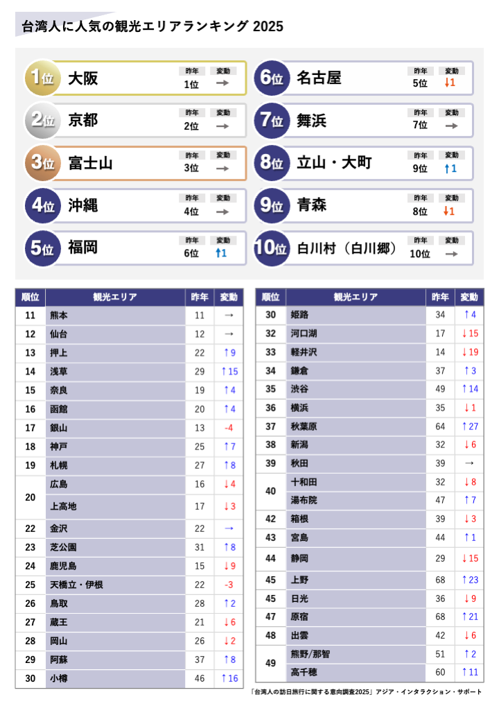 台湾・香港人向け日本旅行情報Webメディア「步步日本(ブーブーニホン)」を運営し、訪日インバウンド向けサービスを提供する株式会社アジア・インタラクション・サポート (愛知県名古屋市、代表取締役:青木達夫) は、「訪日台湾人の人気観光地ランキング2025」を発表します。