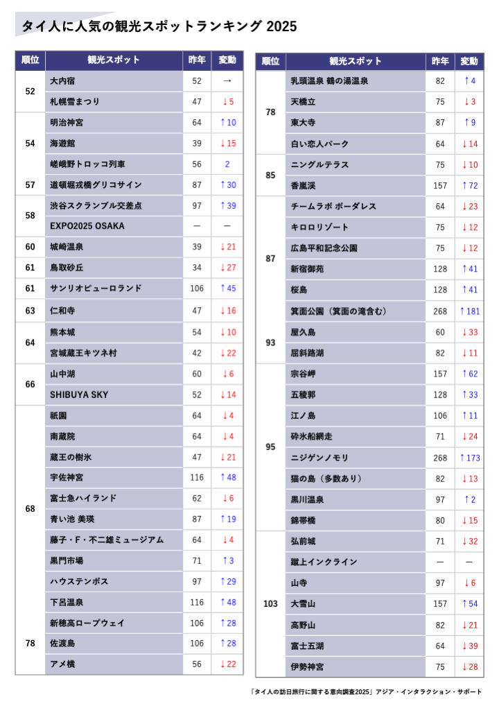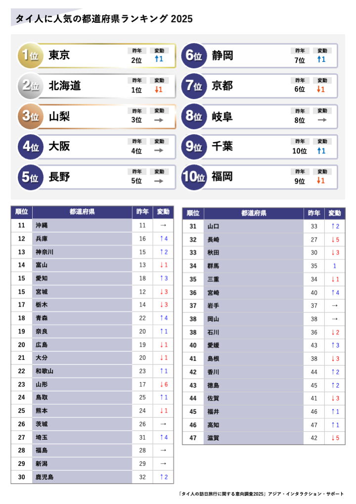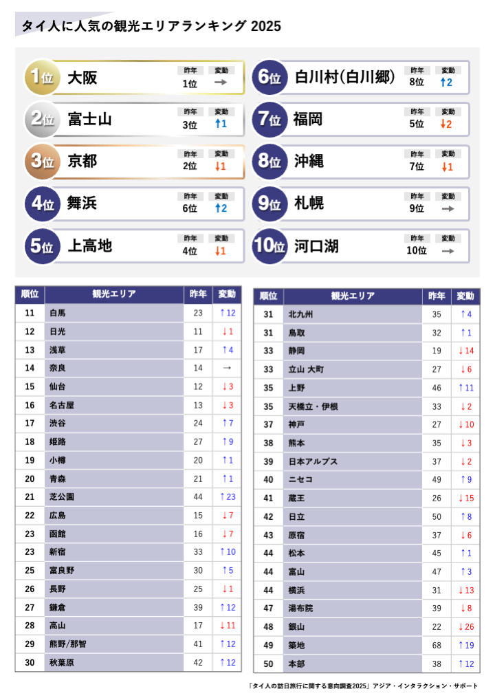 タイ人向け日本旅行情報メディア「Chill Chill Japan(チルチルジャパン)」を運営し、自治体・企業向けに訪日タイ人向けプロモーションを行う株式会社アジア・インタラクション・サポート(本社:愛知県名古屋市、代表取締役:青木達夫)は、「訪日タイ人の人気観光地ランキング2025」を発表しました。